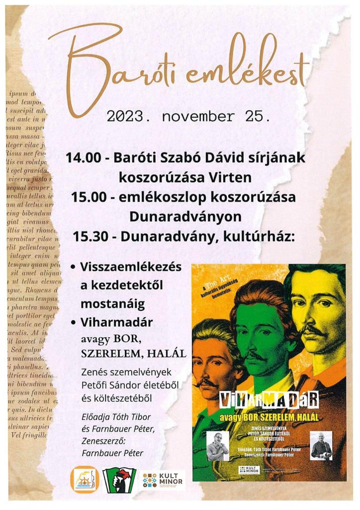 Idén is, úgy mint minden évben november végén megemlékeztünk Baróti Szabó Dávid-ra, magyar költő és nyelvújító, jezsuita, később világi pap és tanár halála emléknapján. Az idei szavalóverseny anyagi okok miatt elmaradt és helyette “Baróti emlékest” került megrendezésre a Dunaradványi kultúrházba “Visszaemlékezés a kezdetektől mostanáig” jeligével. Köszönöm mindenkinek, aki eljött és résztvett ezen a megemlékezésen.
